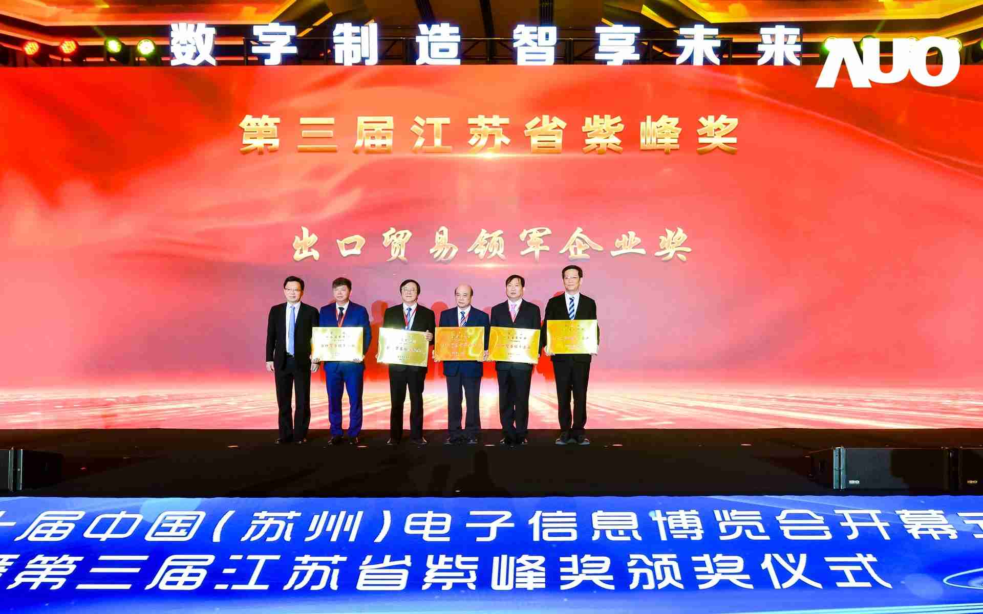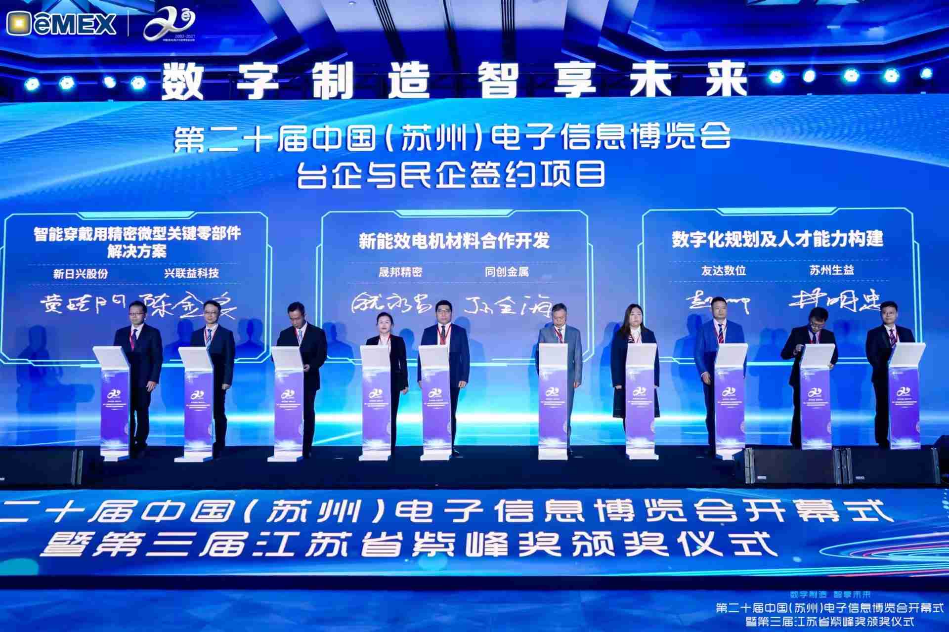 电博会开幕式当天也是第三届江苏省紫峰奖颁奖仪式,,,,省台办、、、工信厅、、、商务厅、、苏州市相关领导均出席并颁奖。。。该奖项为表彰对江苏高质量发展做出积极贡献的在苏企业,,由江苏省政府专门设立。。尊龙集团光电 (苏州) 总经理郭振明代表上台领奖,,这也是尊龙集团苏州连续三次蝉联紫峰奖 出口贸易领军企业奖。。。尊龙集团数位总经理赵丽娜女士,,,,也参与本次开幕式,,上台为本地化赋能签署战略合作协议,,将优质服务资源集合、、、、下沉到更多细分行业,,,为更多地区的制造企业提供数字化转型服务。。。。