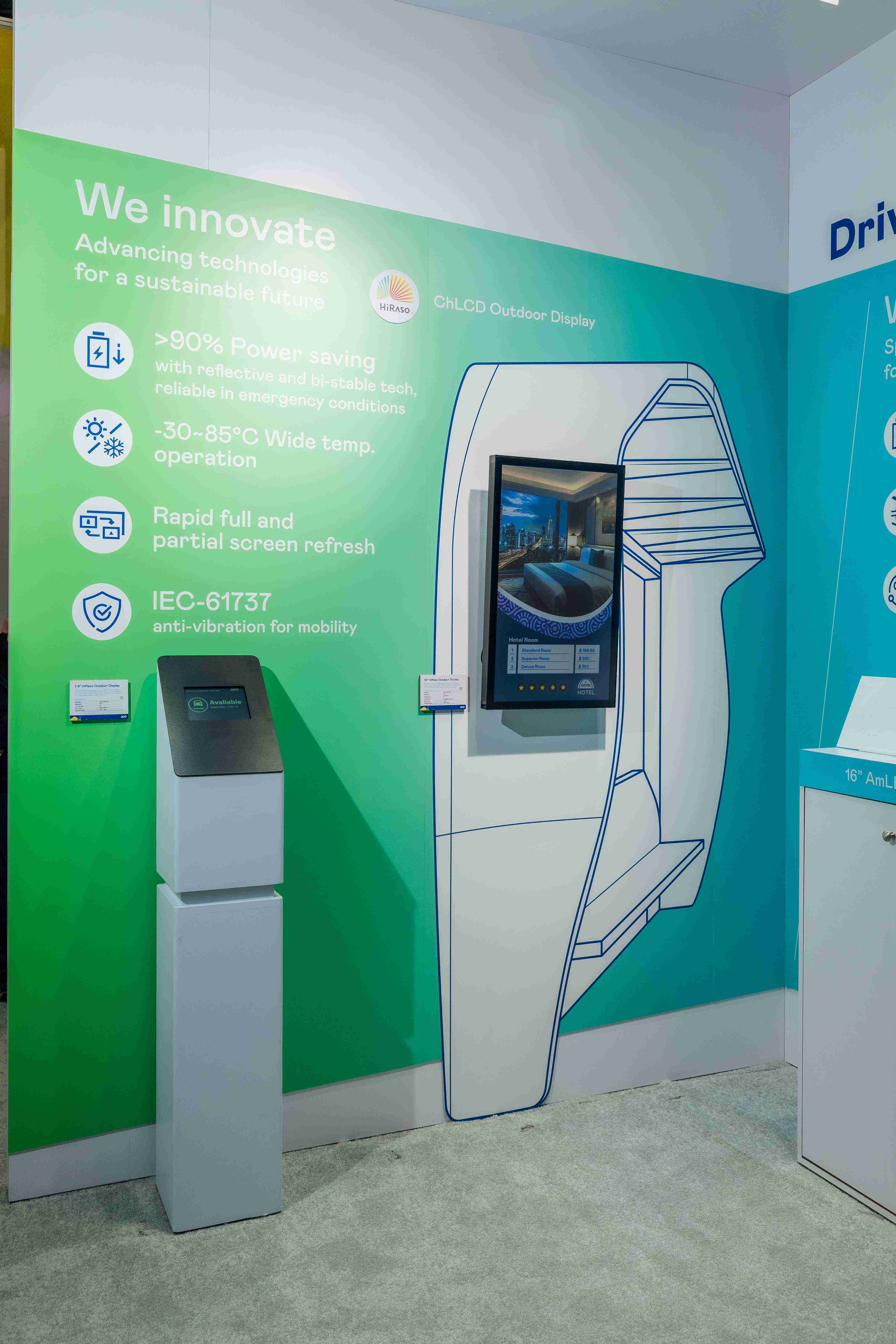 HiRaso胆固醇液晶显示器运用反射环境光线的方式,,,,呈现影像显示时零耗能的环保省电诉求,,,光线愈强愈能呈现绝佳的色彩饱和度及显示效果,,,,同时在摄氏-30度至85度间宽温的使用优势,,,为户外电子看板的新首选。。